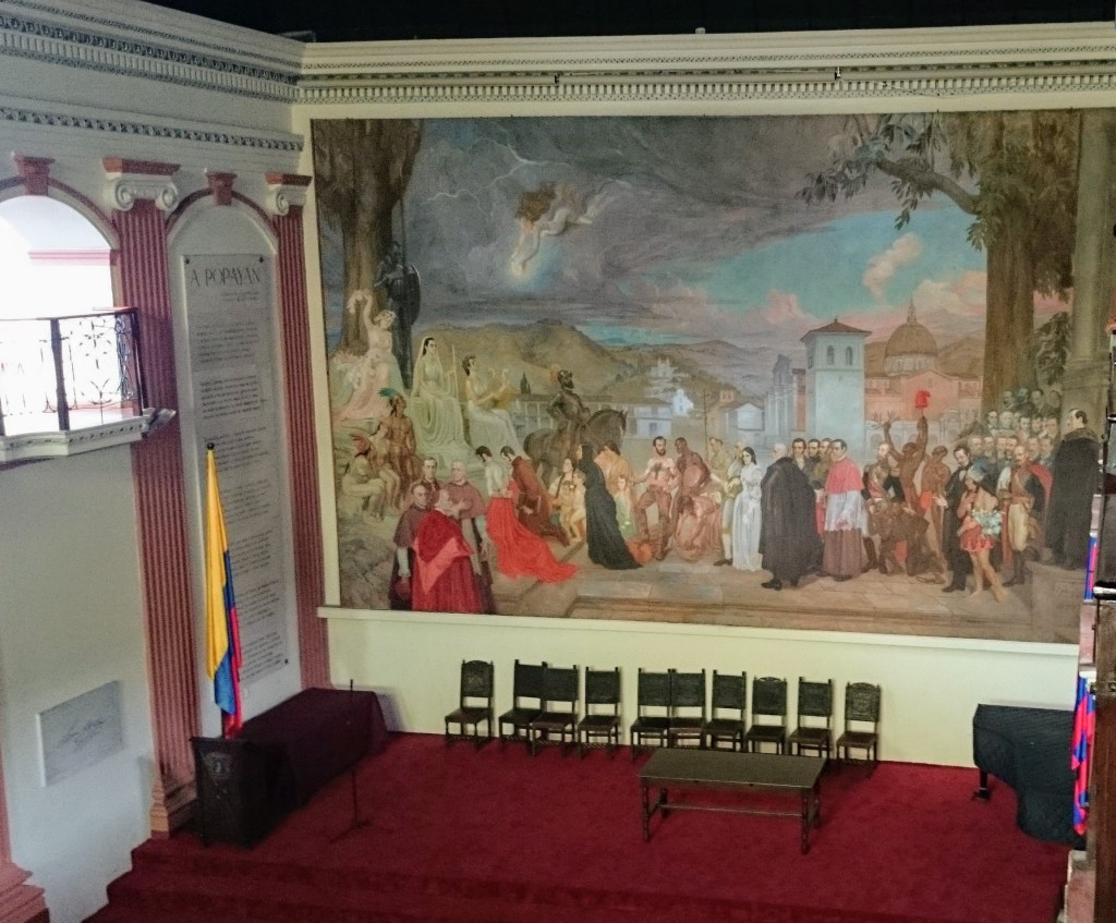 8.- Facultades. Popayán también es conocida como la ciudad universitaria por el nivel académico de su cátedra y porque las facultades se encuentran dispersas por la ciudad; la Apoteosis de Popayán es una pintura al óleo llena de significado y ubicada en el paraninfo de la Universidad del Cauca.